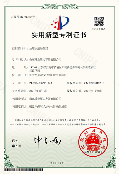 油罐快速加热器专利证书