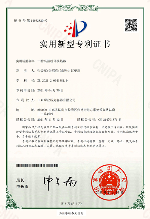高温粉体换热器专利证书